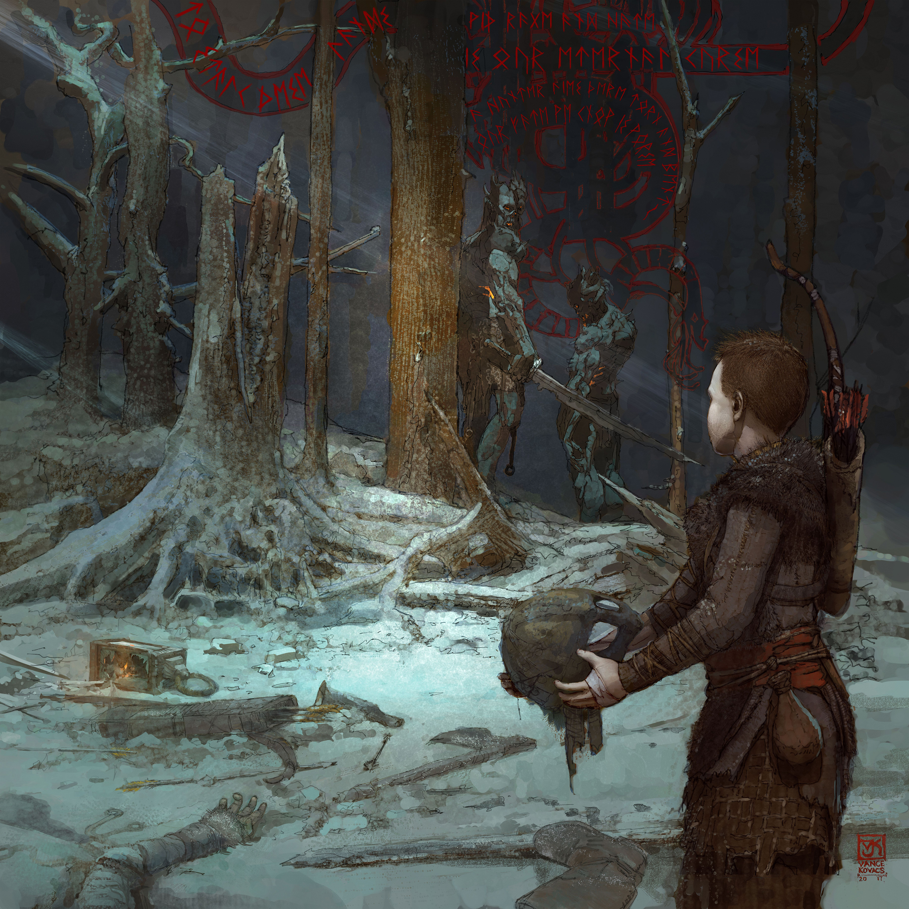 In the beginning, finding the right look for each realm was quite challenging, as the goal was to make them look very distinctive. During the three and a half to four years in which Sony Santa Monica worked on the game, the concept team prepared "hundreds if not thousands" of drawings for this purpose. For instance, just to find the look of Alfheim, it took three to four months, while Helheim required a couple of months.